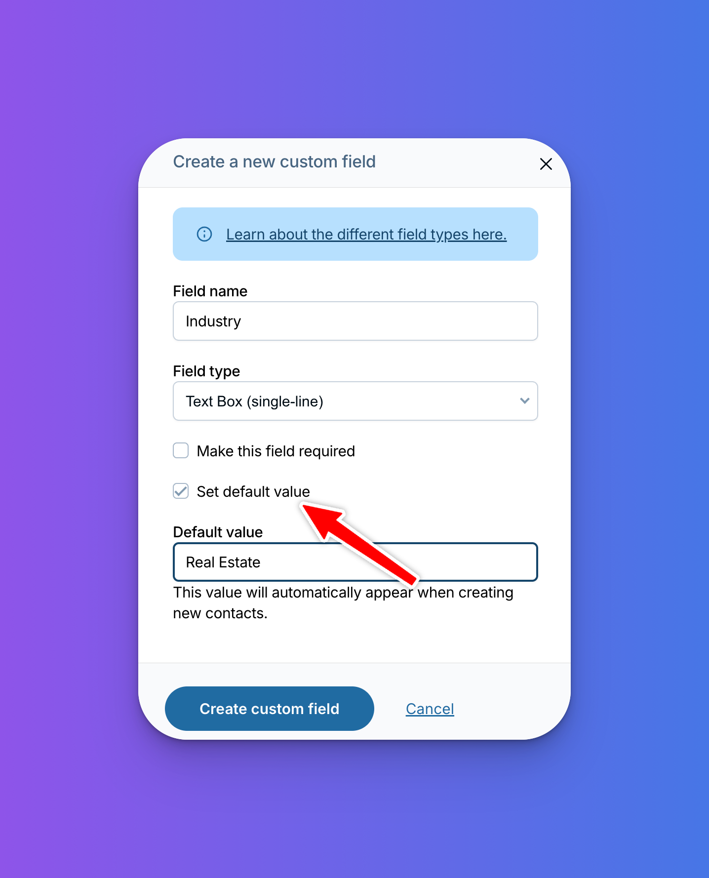 A common example I’ve heard from customers is that maybe 90% of their customers work in one industry, so it’s a hassle to manually type the industry in every time. But maybe that other 10% of customers varies wildly and it doesn’t make sense to use a dropdown field. That’s where a default option for a text field comes in handy. Now, it’s possible to have a default value filled out for the 90% of the time that the default field applies.