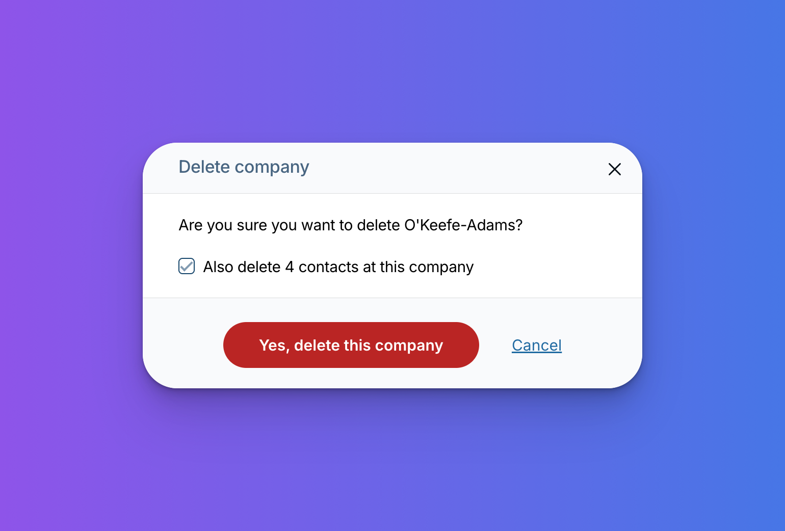 Simply check the box if you’d like the associated contacts to be deleted in addition to the company.
